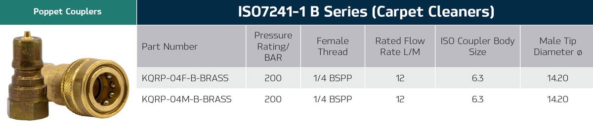 Manufactured from brass. Standard seals are nitrile, back up rings are PTFE. Viton seals are available on request. Interchanges with DNP PBV1, Faster HNV, Hansen HK, Parker 60 series - H, Aeroquip 60B/F6600 and Safeway S10. Used for Carpet Cleaners |