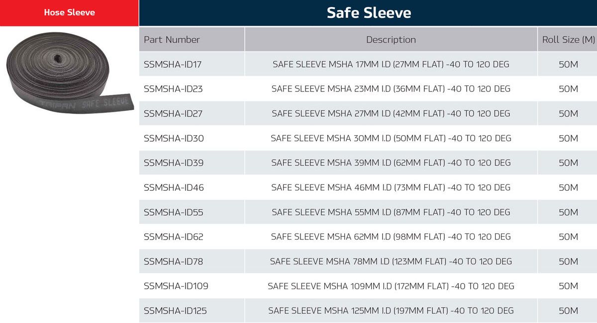 MSHA approved. Meets the requirements of ISO 3457, EN4413 and EN1299. Recommended for use to protect personnel nearby from hose bursts (pinhole tested). Recommended temperature range -40°C to 120°C - UV resistant. Material - Polyester |